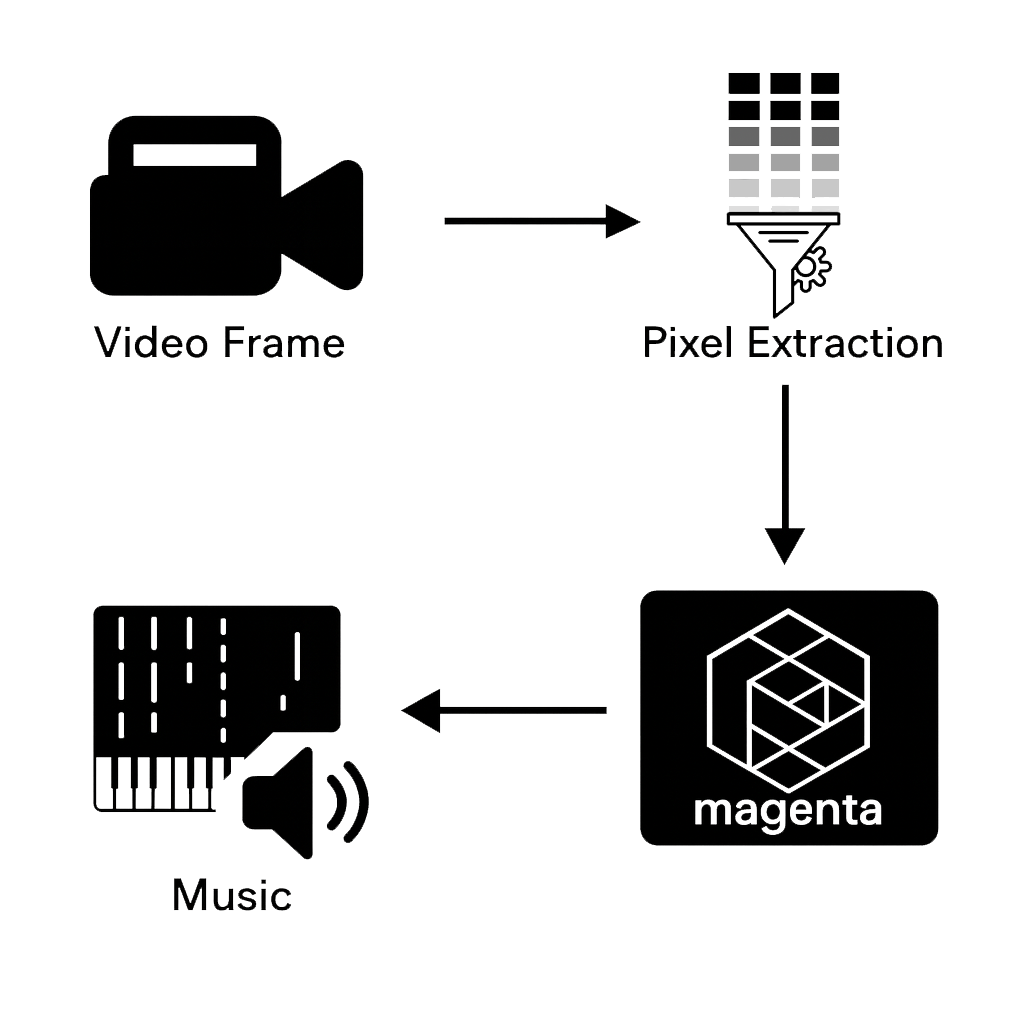 We tried to compose music using only video as input and relying on basic CV methods to pre sort the data given in a video, which was then fed to an AI model by Google to decide the rhythm and instrument, based on our input.